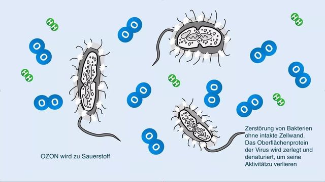 Das Ozon wirkt Wunder, das eliminiert die Viren, Bakterien, Pilzen und Würmer und kann diese abtöten bzw. in ihrer Aktivität hemmen. Außerdem verbessert das Ozon die Eigenschaften der roten Blutkörperchen, wodurch diese den Sauerstoff leichter freisetzen. Dies erhöht die Sauerstoffabgabe und führt dazu, dass der Sauerstoff leichter vom Gewebe aufgenommen wird. Darüber hinaus sorgt das Ozon für eine bessere Flexibilität und Verformbarkeit der roten Blutkörperchen, wodurch der Sauerstofftransport optimiert wird. Da das Ozon zudem die weißen Blutkörperchen anregt, werden zusätzlich die körpereigenen Abwehrkräfte gestärkt.