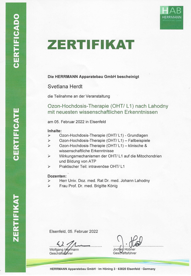 Ein erfolgreichen Kur soll 10 Sitzungen L1 (Ozonhochdosistherapien) beinhalten. Bei sehr hartnäckigen chronischen Erkrankungen sind manchmal auch 20 Behandlungen nötig.